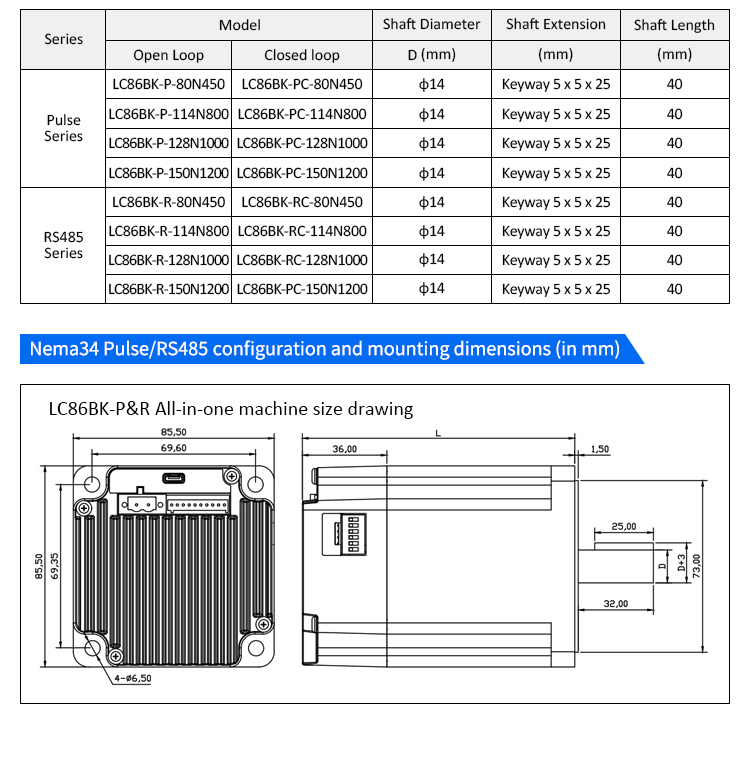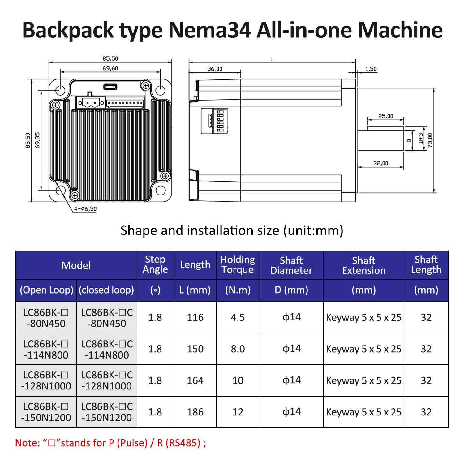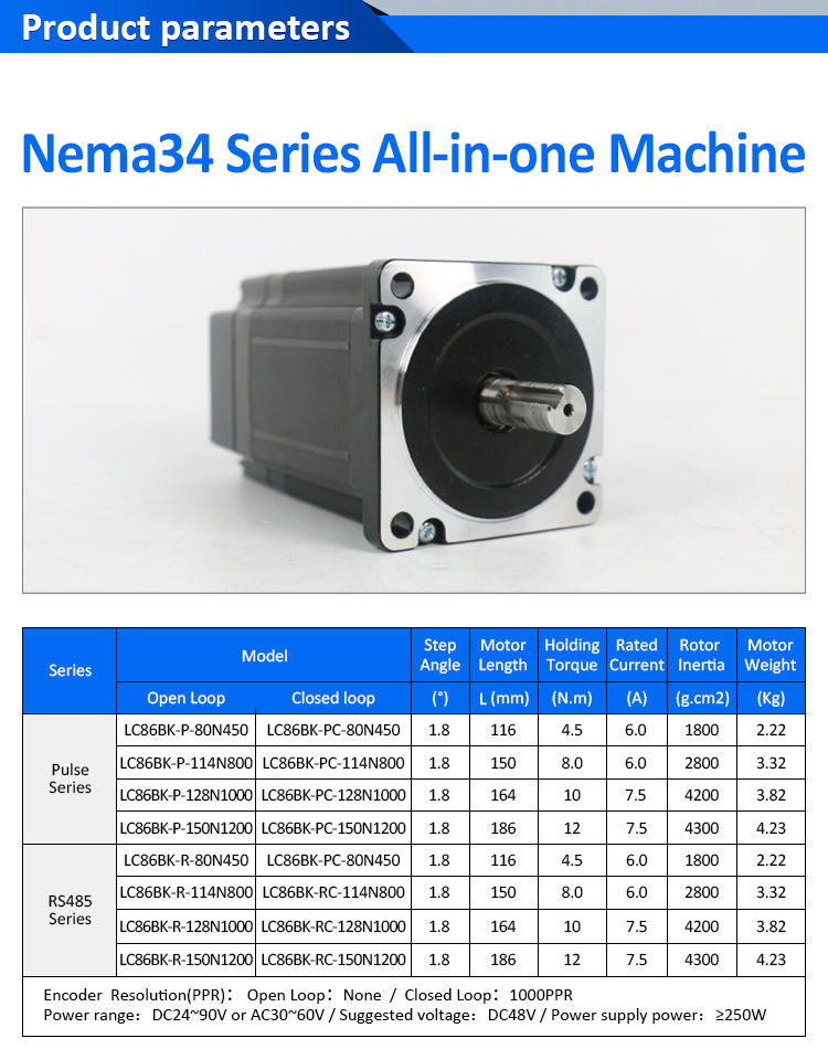 Tipo de mochila NEMA34 LOOP ABERTO O MOTOR Integrado de loop fechado possui loop aberto/loop fechado. Que possui controle de pulso/rs485. Programa de processamento de alarmes Pulse/RS485. Operação estável com aumento da temperatura e aumento da temperatura, nenhum suporte de perda de etapa. O sistema de passo tudo-em-um que economiza espaço simplifica a instalação. Tamanho do flange: 86 mm. Ângulo do passo: 1,8 ângulo de passo. Segurando o torque 4.5/8.0/10/12n.m. Resolução do codificador (PPR): LOOP aberto: Nenhum / Loop fechado: 1000ppr. Faixa de potência: DC24 ~ 90V ou AC30 ~ 60V/Tensão sugerida: DC48V/Fonte de alimentação POWER: ≥250W. Somos fábrica original, temos certificado CE, ROHS.